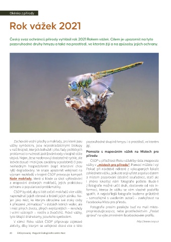 Český svaz ochránců přírody vyhlásil rok 2021 Rokem vážek. Cílem je upozornit na tyto