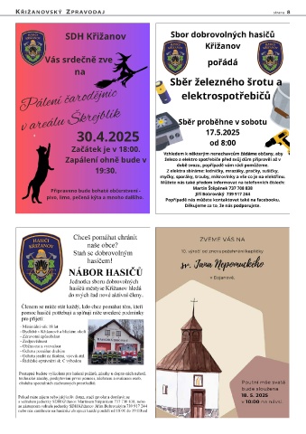 k řižanovsk Ý zpRavoDa j strana 8 SDH Křižanov Vás srdečně zve na Pálení čarodějnic v areálu Škrejblík 30.4.2025 Začátek je v 18:00. Zapálení ohně bude v 19:30. Připraveno bude bohaté občerstvení - pivo, limo, pečená kýta a mnoho dalšího.