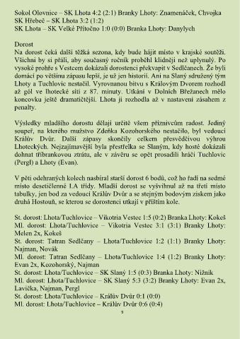 Ml. dorost: Lhota/Tuchlovice – SK Slaný 5:3 (3:2) Branky Lhoty: Evan 2x,
