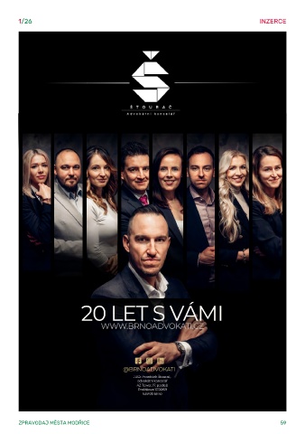 1/26 INZERCE 20 LET S VÁMI WWW.BRNOADVOKATI.CZ @BRNOADVOKATI JUDr. František Štourač, advokátní kancelář AZ Tower, 17. podlaží Pražákova 1008/69 639 00 Brno ZPRAVODAJ MĚSTA MODŘICE 59
