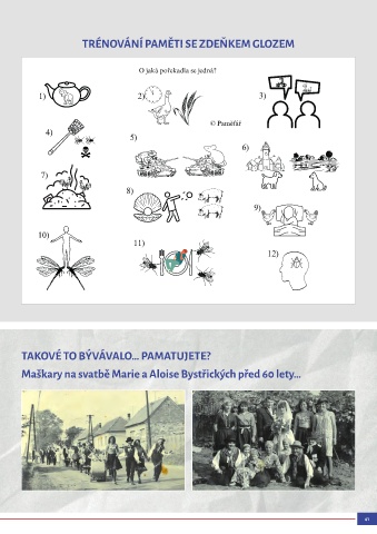 TRÉNOVÁNÍ PAMĚTI SE ZDEŇKEM GLOZEM O jaká pořekadla se jedná? 1) 2) 3) © Paměťář 4) 5) 6) 7) 8) 9) 10) 11) 12) TAKOVÉ TO BÝVÁVALO… PAMATUJETE? Maškary na svatbě Marie a Aloise Bystřických před 60 lety… 41