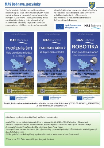 rozvoje v MAS Bobrava“. Kluby jsou určeny dětem Pro přihlášení či více informací kontaktujte