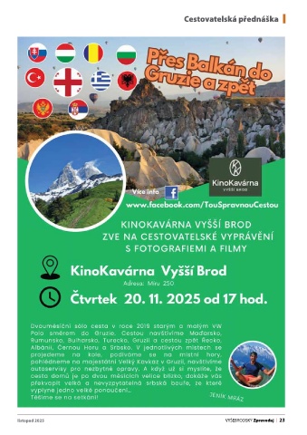 Zpravodaj_listopad_2025_Sestava 1 26.10.2025 6:32 Stránka 23 Cestovatelská přednáška listopad 2025 VYŠEBRODSKÝ Zpravodaj 23